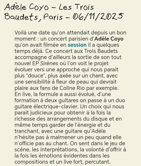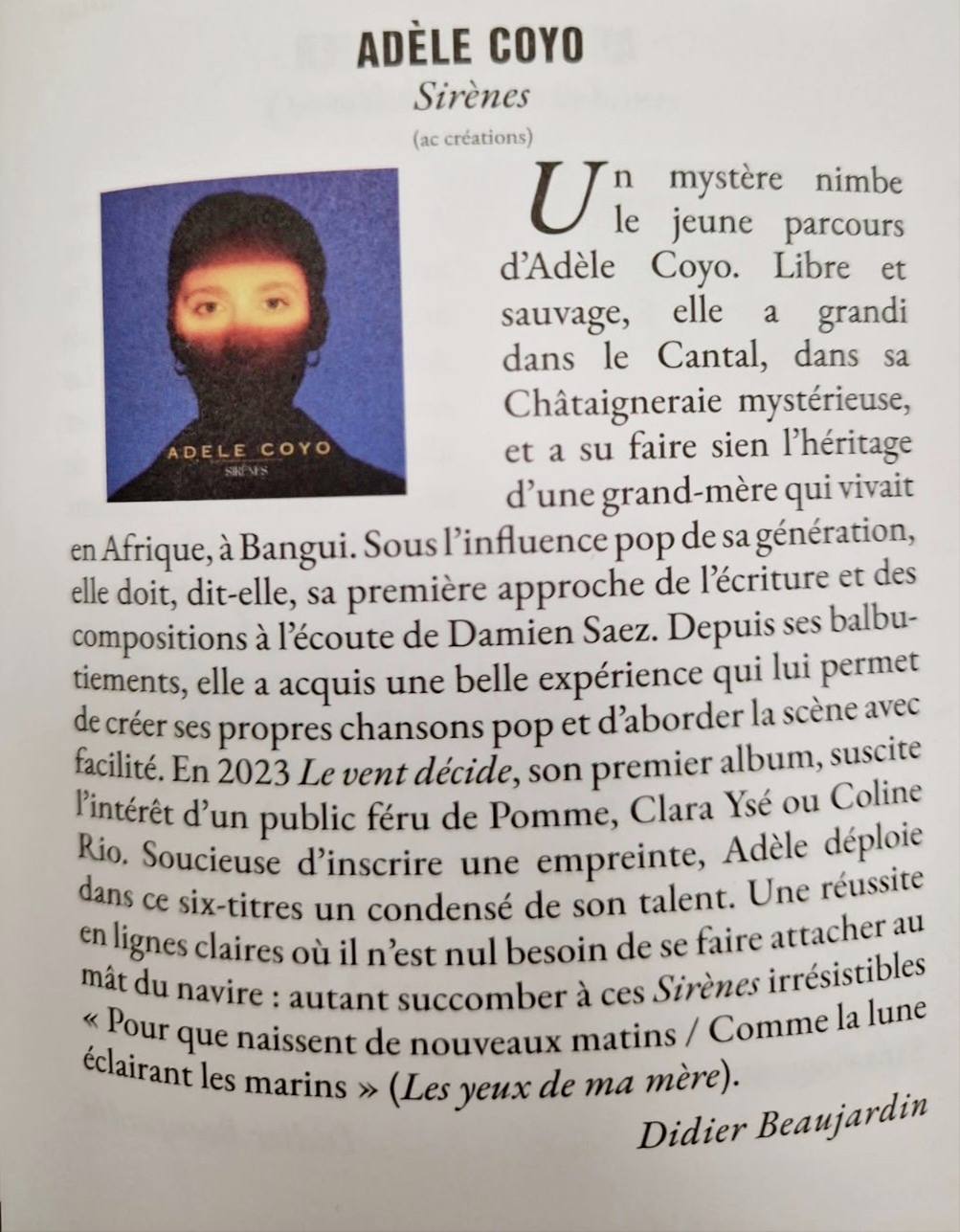 « … on tombe sous le charme d’une folk artiste, cool comme une Joni Mitchell francophone en apesanteur. » Gérard Bar-David